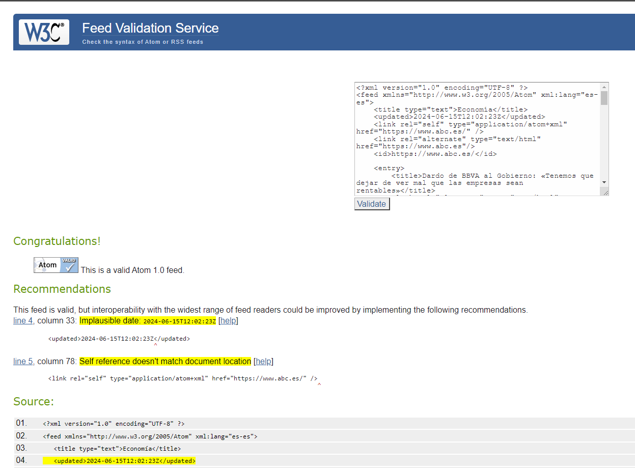 Validación de un canal RSS o Atom usando W3C feed Validation Service