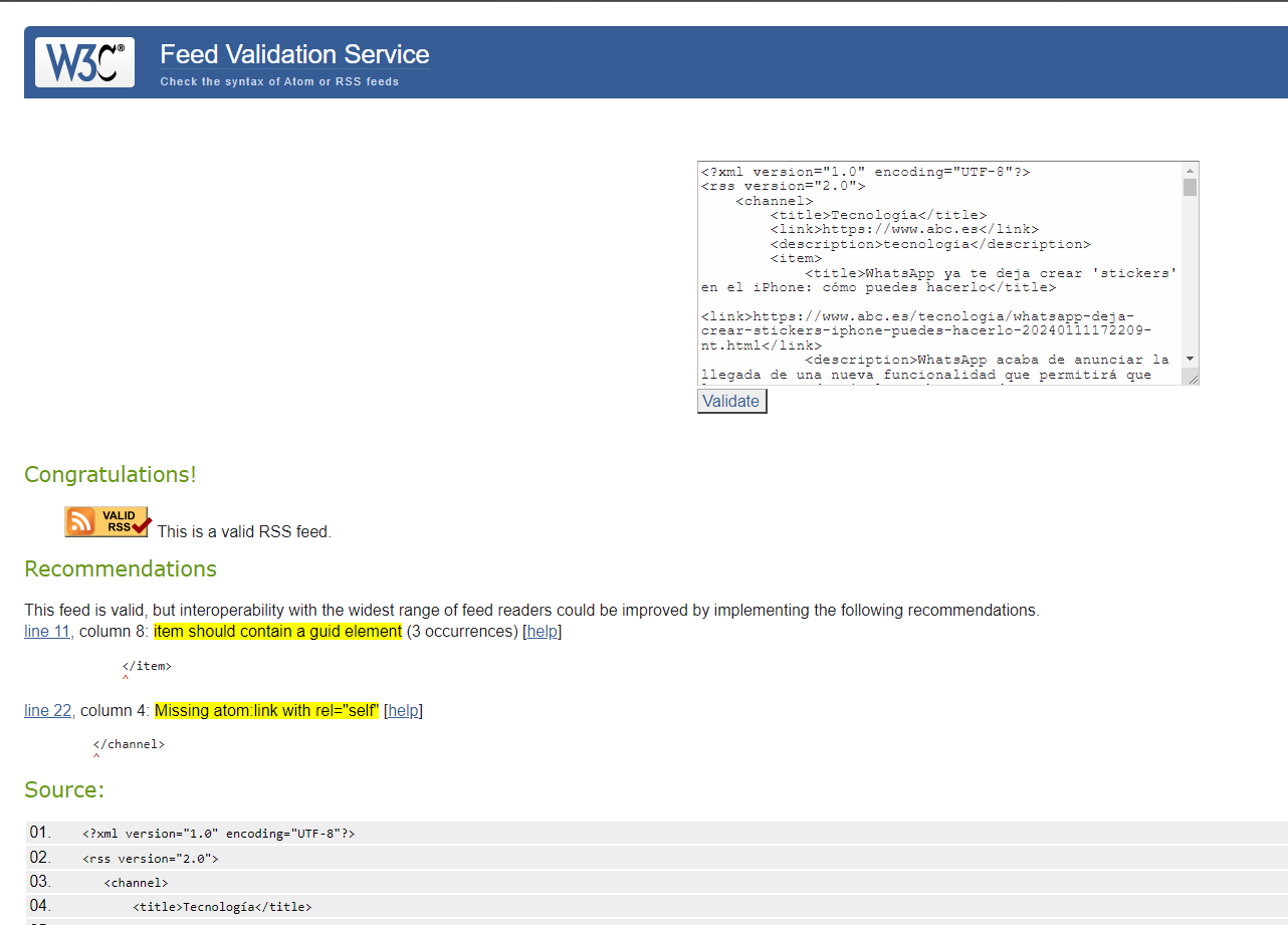 Validación de un canal RSS o Atom usando W3C feed Validation Service